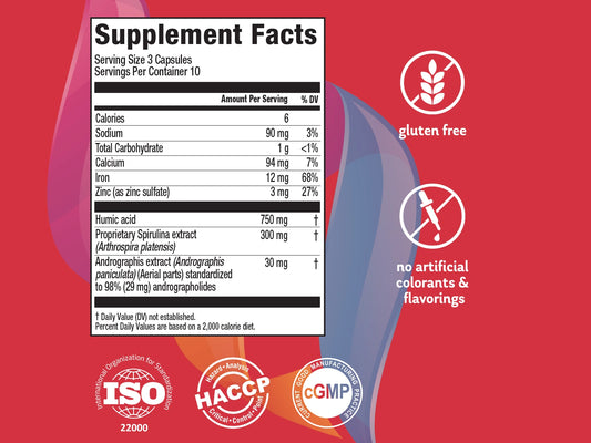 Two components were recently recognized as playing a key role in Spirulina’s immune supporting properties: Phycocyanin, a pigment used as a natural food colorant, supports hematopoiesis and normal function of immune system cells, and Calcium-Spirulan, a polysaccharide unique to spirulina containing both sulfur and calcium, which also has a beneficial effect on the immune system.*