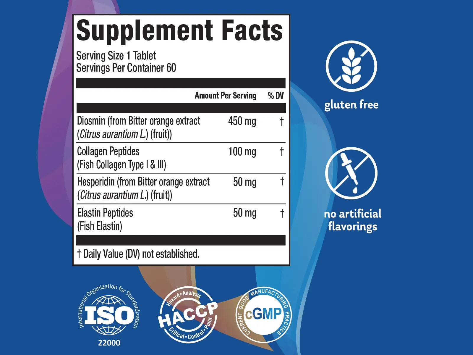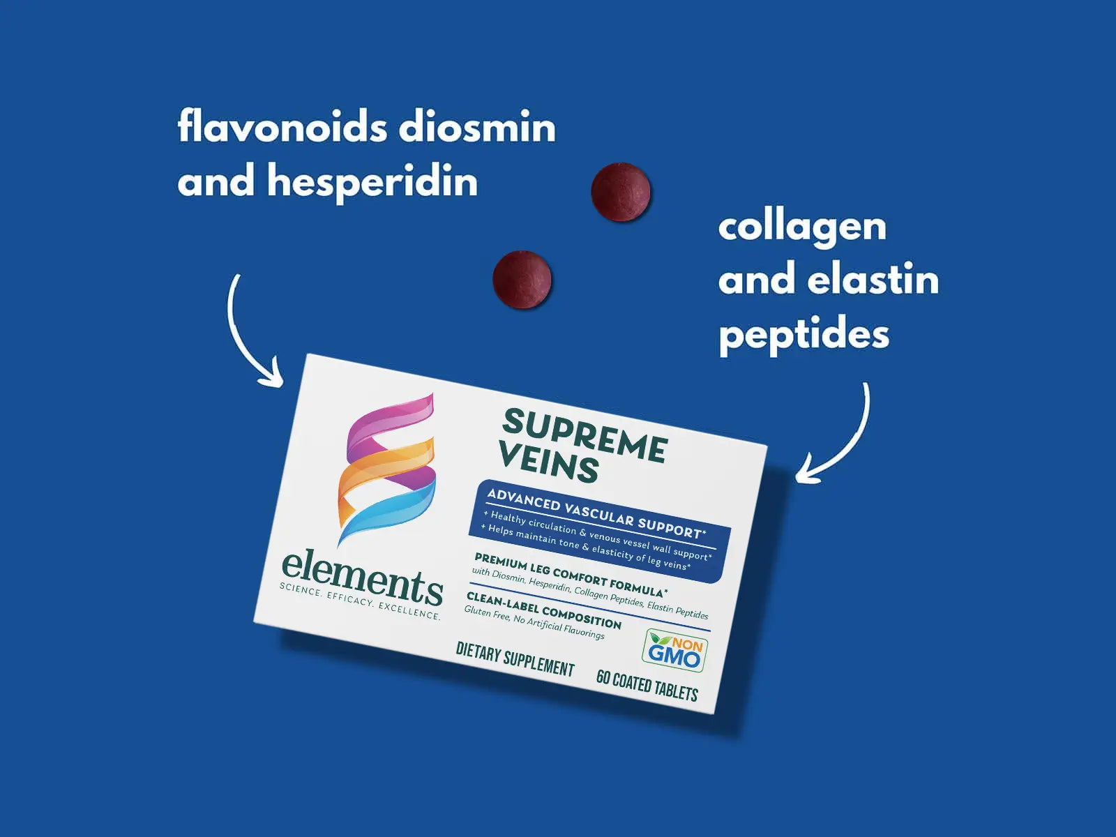 Supreme Veins Diosmin and Hesperidin are micronized, reducing-nutrient particle size for better absorption and efficacy.* Supreme Veins contains also collagen type III and elastin peptides, which help promote strong blood vessels19,20.*
