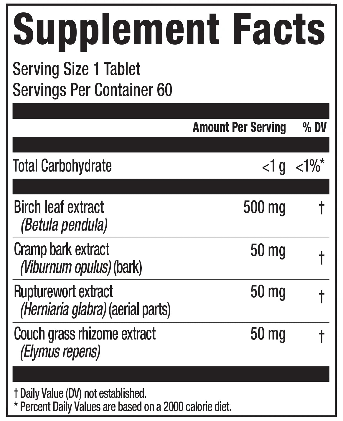 Other Ingredients: Birch leaf extract (Betula pendula), Cramp bark extract (Viburnum opulus) (bark), Rupturewort extract (herniaria glabra) (aerial parts), Couch grass rhizome extract (Elymus repens), Microcrystalline Cellulose, Polyvinylpyrrolidone, Coating Film (Hypromesllose, Polyethylene Glycol, Rice Starch, Sucrose esters of fatty acids, Microcrystalline Cellulose, Hydroxypropyl Cellulose, Iron oxide yellow (Color), FD&C Blue No. 1 (Color)), Magnesium Stearate (Vegetable).